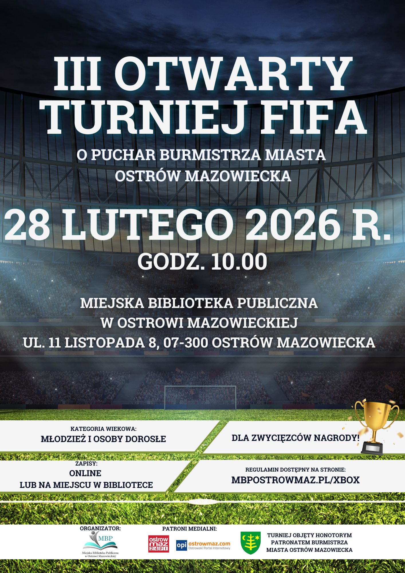 Miejska Biblioteka Publiczna w Ostrowi Mazowieckiej zaprasza na III Otwarty Turniej FIFA o Puchar Burmistrza Miasta. Wydarzenie odbędzie się 28 lutego 2026 roku o godz. 10.00 w siedzibie biblioteki przy ul. 11 Listopada 8.