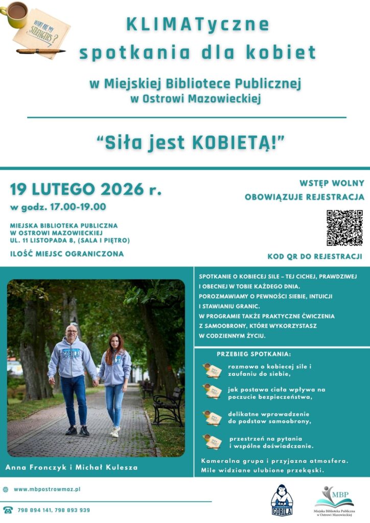 W Miejska Biblioteka Publiczna im. Marii Dąbrowskiej w Ostrowi Mazowieckiej odbędzie się wyjątkowe spotkanie dla kobiet pod hasłem „Siła jest kobietą!”. Wydarzenie skierowane jest do mieszkanek, które chcą wzmocnić swoją pewność siebie, porozmawiać o bezpieczeństwie oraz odkryć drzemiącą w nich moc.