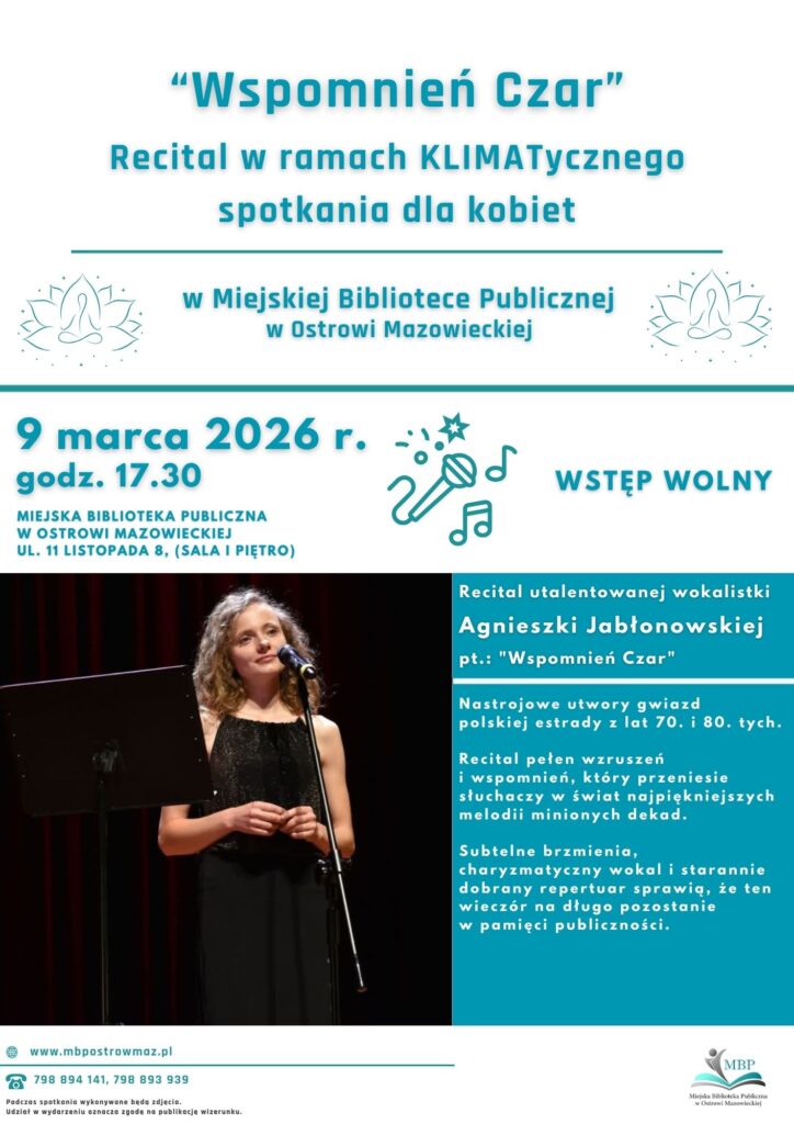 Już 9 marca 2026 roku o godz. 17.30 w Miejskiej Bibliotece Publicznej w Ostrowi Mazowieckiej odbędzie się recital pt. „Wspomnień Czar”. Wydarzenie organizowane jest w ramach KLIMATycznego spotkania dla kobiet, a wstęp na nie jest wolny.